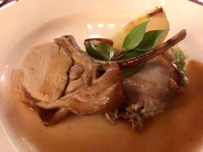 E poi, con carrè di maialino da latte cotto al forno con mirto e ginepro verza ripassata e mela annurca.