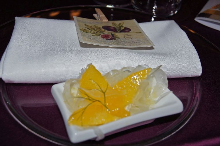 Ad aprire, finocchi marinati all’arancia e asparagi al vapore con yogurt e fragole.
