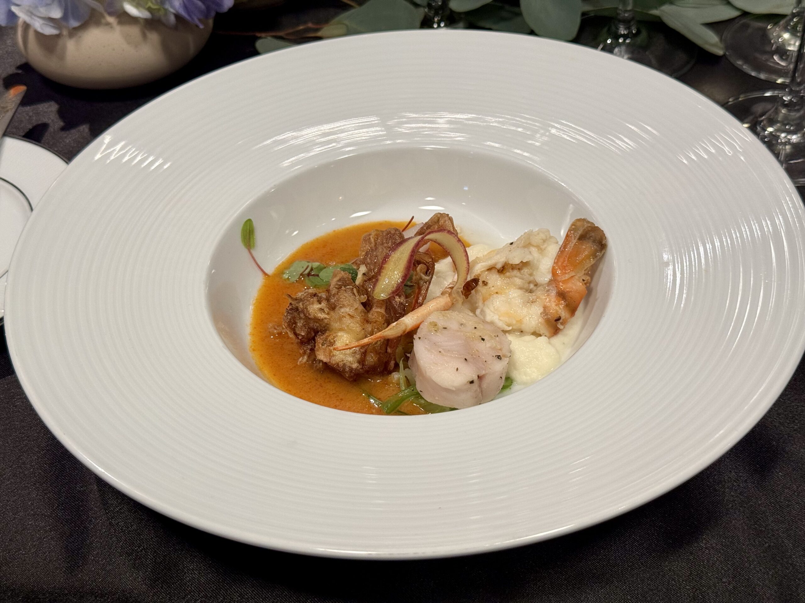 Siamese carp, cray fish, soft shell crab, palm heart purée, celery noodles, tamarind, red curry, coconut air By Chef Michael Bao