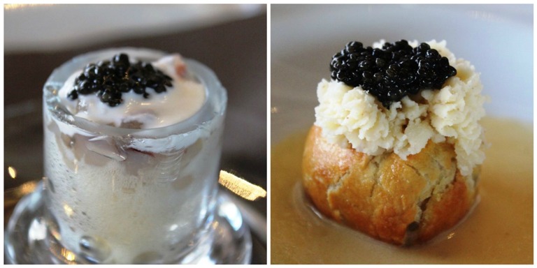 Dispensa pane e vini, gamberi in bianco e nero tartare di gamberi con spuma di agrumi panna acida e caviale e sfogliatina di patate con caviale e salsa al burro bianco