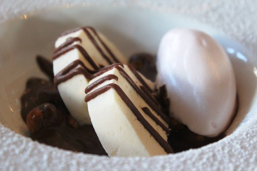 Dispensa pani e vini, semifreddo alla vaniglia con salsa al barolo chinato e cioccolato con gelato al pompelmo rosa