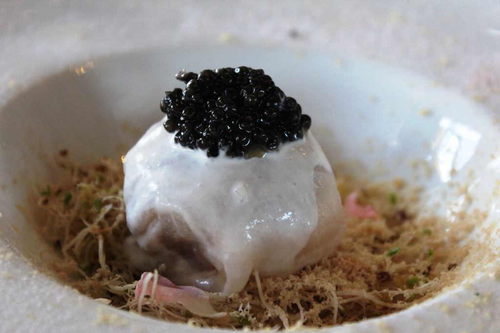 Zuccotto di storione: gelato di storione con carpaccio di storione panna acida caviale, polvere di campari e germogli. Un piatto molto complesso giocato su toni acidi e salati, con note terragne evidenti ma molto eleganti.