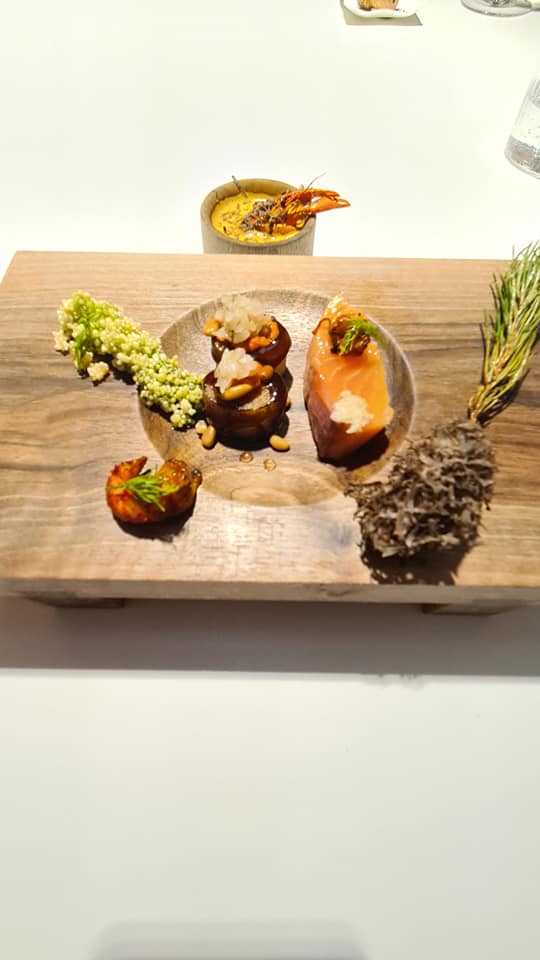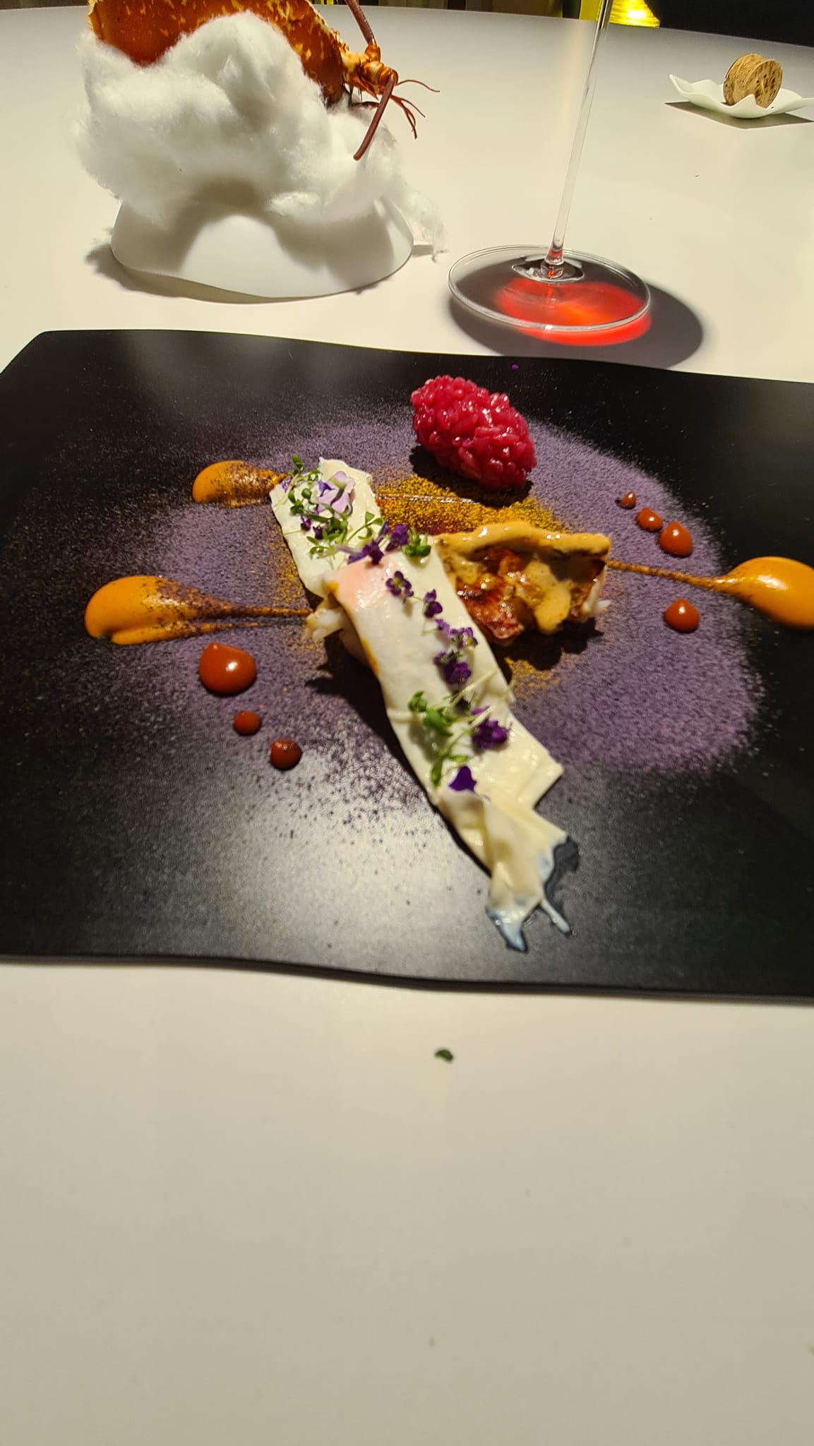 Tonno rosso con pomodori e Astice della Galizia svegliandosi sulle spiagge di Goa, la consistenza come ingrediente, duo di buoi, cotture precise però il continuare con grassezza e note di rancido, mi è sembrato più un lavoro egocentrico ed edonistico.