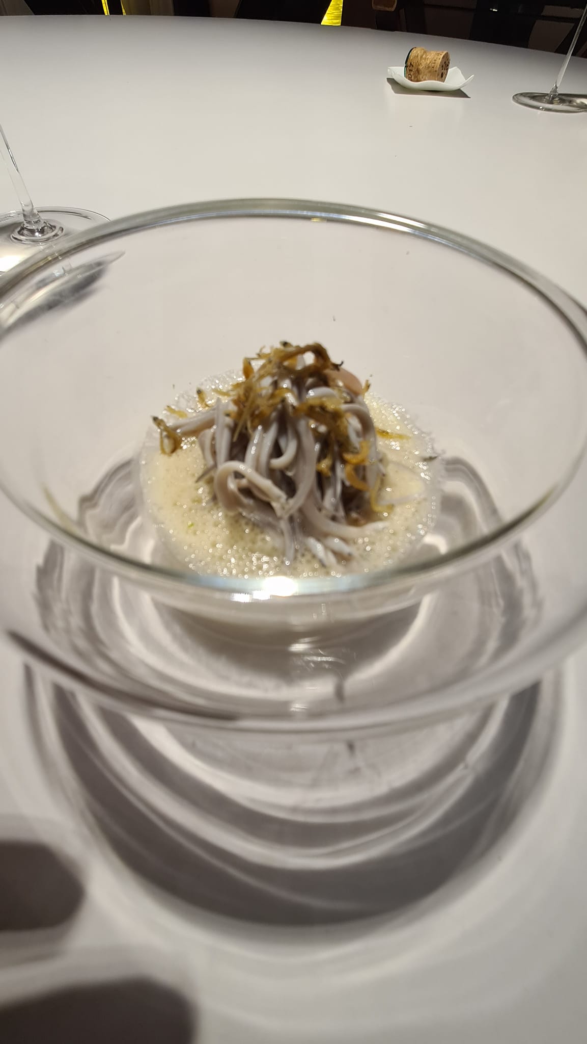 Sashimi tiepido di baby anguille fritte al contrario, un piatto che ci ha lasciato perplessi. Le piccole anguille vengono abbattute a -40° centigradi (per irrigidirne la spina dorsale), scongelate e irrorate con olio bollente davanti al cliente. Cambia la consistenza delle anguille, ma ne compromette il sapore, un giochino tecnico fine a se stesso, se hai una materia così pura e lo scopo finale e solo cambiarne la consistenza, diventa una cosa incomprensibile..