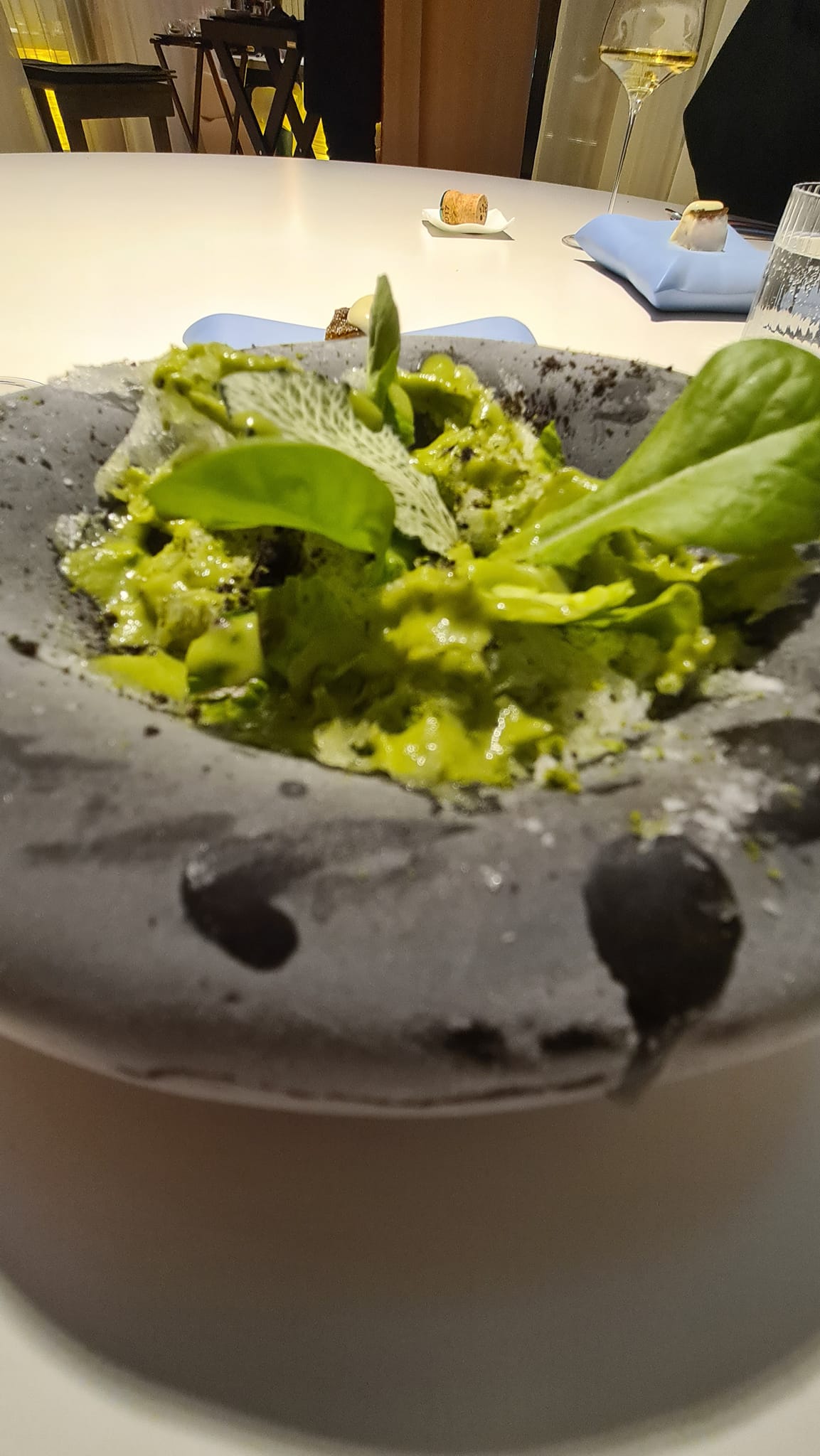 Ogni generazione pensa di essere più rivoluzionaria e trasgressiva della precedente. DiverXo è come i Maneskin, bravi, ma i Rolling Stones, in questo caso Ferran Adria ed El Bulli erano un fatto diverso. L’avanguardia di David Muñoz è un fatto edonistico, le sensazioni palatali si sono concentrate per tutta la seconda parte della cena su grassezza e note di rancido, annoiandoci non poco, il piccione servito come prima portata un autogol. Le provocazioni sono nelle scene e nell’ambientazione più che nelle sensazioni palatali, per usare un’espressione da social “Bene, ma non benissimo”.