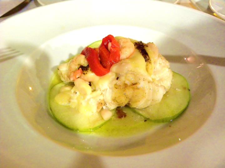 Così, tra i vari piatti provati a tavola, scegliamo questa pietanza dalla lunga descrizione di territorio: Merluzzo cotto sotto vuoto, Mela verde, crema di fagioli e gamberi e giusto due striscette di peperoni rossi a rallegrare il piatto; tutto condito con olio extra vergine d’oliva ovviamente della zona. Prodotti del territorio, Vino DO frutto di una “pesca miracolosa” andata bene, il lento scrosciare del mare in una pigra serata estiva … qualcuno ha forse detto sangria?!