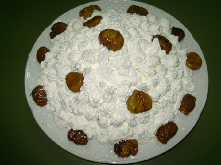 Guarnite la preparazione sistemando dei marron glacè tutt’intorno e, se volete, delle scaglie di cioccolato fondente sulla panna, e una spolverata di cacao amaro . Il vostro dolce di castagne è pronto.