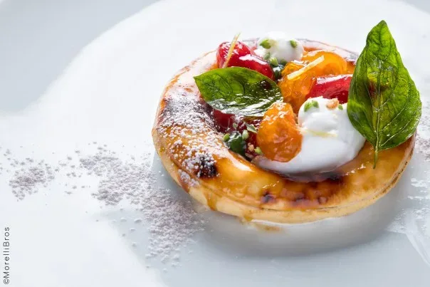 Posizionare i cornicioni al centro del piatto, riempirli con i dischi di pan di spagna, mettere il gelato sul disco e mettere i datterini sul gelato. Spolverare con una miscela di cacao e zucchero a velo come se fosse una polvere di brace, decorare con le foglie di basilico essiccate, i germogli di basilico e la julienne di limone, infine, con qualche goccia di olio al basilico.