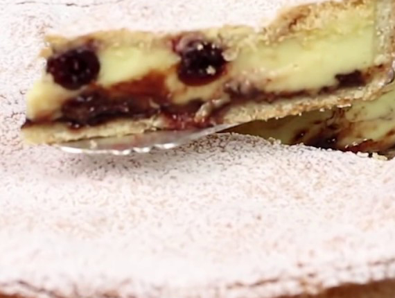Pizza di amarena: Dopo aver fatto raffreddare la crema e la pasta frolla, stendete circa le metà della pasta foderando il ruoto, mettete uno strato di crema, quindi le amarene, poi l’altra parte di crema. Infine coprite con un’altra sfoglia di pasta frolla. Con un tuorlo d’uovo spennellate la superficie della pizza e poi mettete in forno caldo per una quarantina di minuti circa o comunque sin quando la pasta non ha raggiunto il giusto “colore”. Lasciate raffreddare, sformate e cospargete la pizza di zucchero a velo.