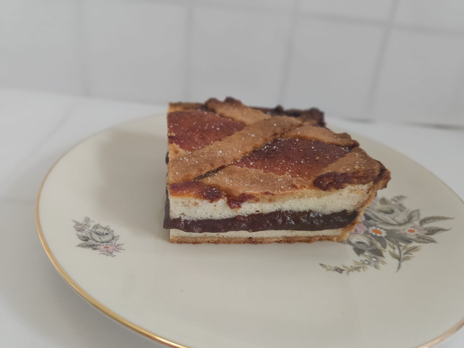 Foderare una teglia rettangolare, precedentemente imburrata ed infarinata, con i due terzi della frolla, riempire con metà dose di ricotta, continuare con la crema al cioccolato e terminare con la ricotta restante.