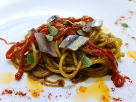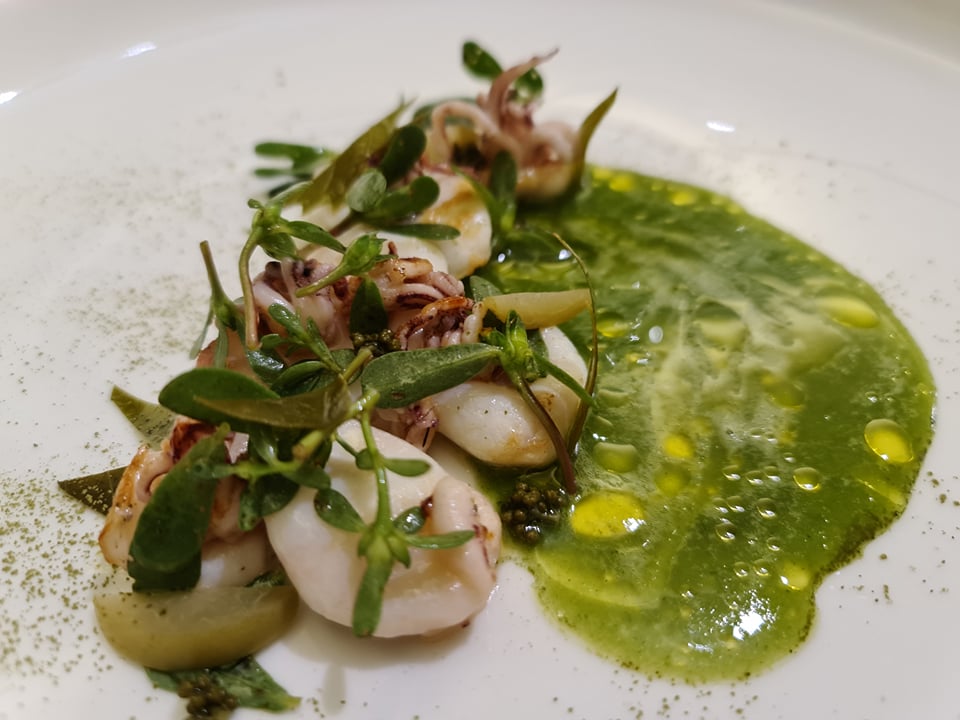 Calamaro e cinghiale sono due opposti non solo provenienza degli ingredienti, ma anche nella concezione. Mentre la salsa diventa protagonista nel calamaro, nel cinghiale viene lasciato spazio al sapore rustico della carne, ed in questo caso la precisione della cottura mostra la mano vera del cuoco.