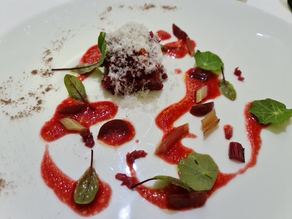 Tartare di Pecora, Susine, Ciliegie e Rosa Selvatica