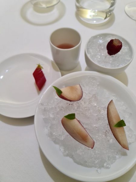 Domenico Marotta ha aperto il suo ristorante nel giugno 2019, una piccola oasi di cucina d’autore al primo piano del ristorante per banchetti gestito dalla famiglia. Un Curriculum di quelli di quelli davvero importanti. Quasi un paio d’anni da Andrea Berton al Trussardi alla Scala, più di tre anni da Enrico Crippa a Piazza Duomo (è andato via da junior sous chef), un anno alla corte Alain Passard e del suo Arpege. Brevi passaggi anche da Éric Frechon, Kobe Desramaults e da Seiji Yamamoto. Un ragazzo riservato, molto timido, che ha deciso di coltivare il suo sogno dell’alta cucina nell’attività della famiglia. E’ la mia seconda volta al Marotta Ristorante, la prima il 5 ottobre del 2019.