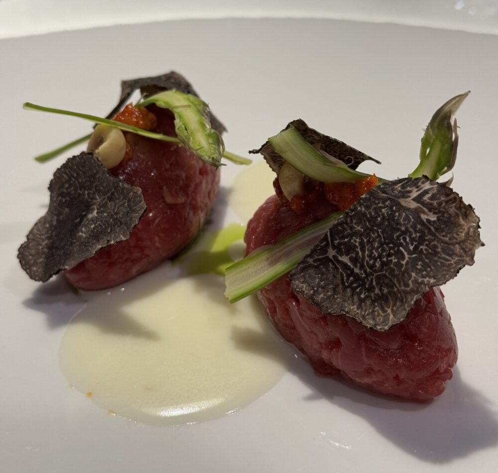 • Battuta di podolica con nocciole croccanti e pecorino di Forenza, un omaggio alla tradizione contadina, accompagnata dal Lerà Rosato IGP, vino elegante e strutturato che valorizza la carne con la sua freschezza.