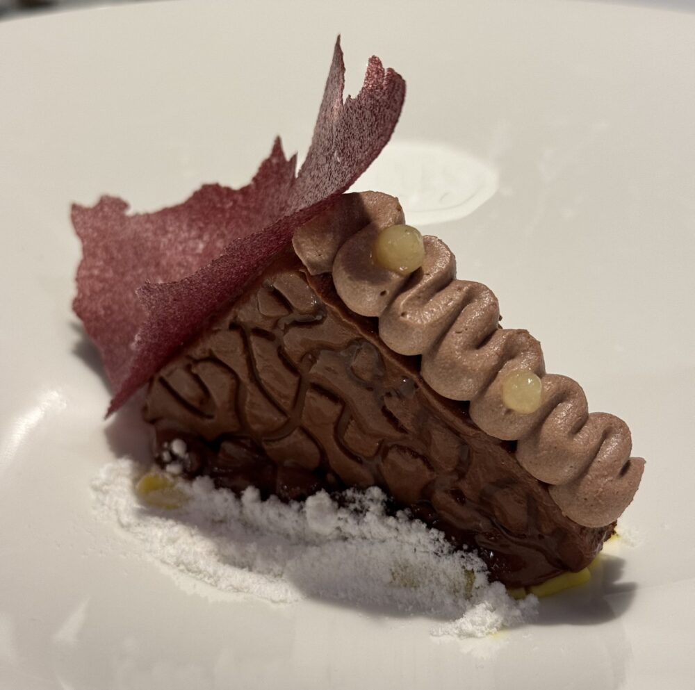 • Un dessert che gioca su contrasti e armonie: cioccolato, confettura extra di pera signora della Valle del Sinni e Aglianico del Vulture Terra dei Re. Un’esperienza di gusto completa, sublimata dal “Vulcano 800” Spumante Brut Rosé.