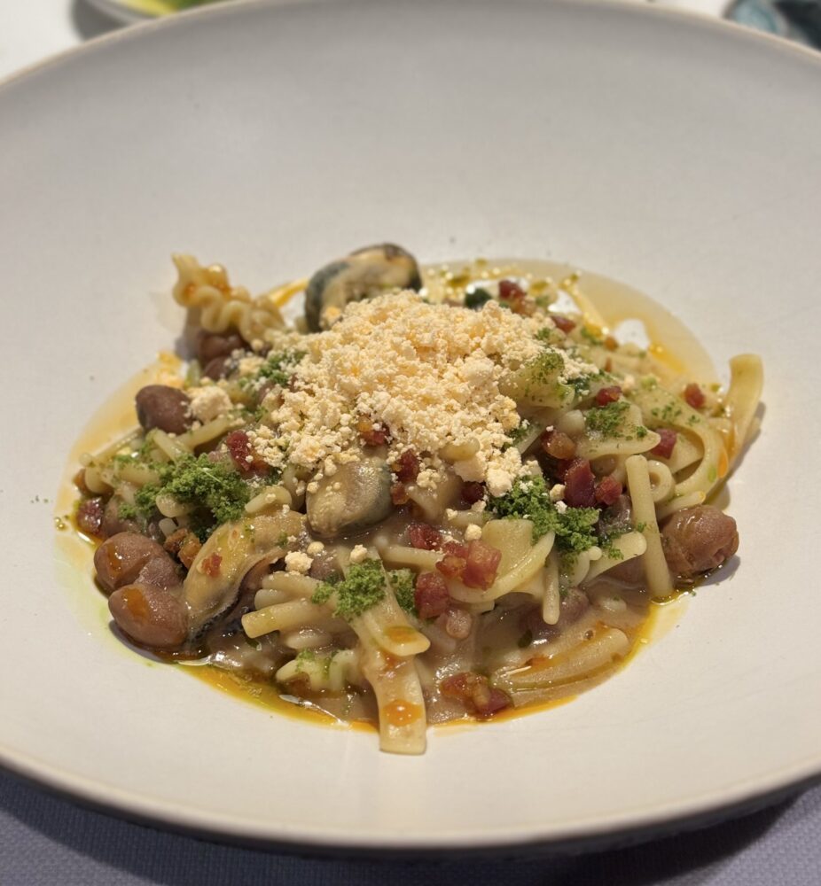 • Pasta mista di Gragnano con fagiolo rosso scritto del Pantano di Pignola, cozze e salsiccia pezzente. Un piatto che gioca sul contrasto tra mare e terra, dove ogni elemento trova il suo equilibrio, esaltato dal profondo Pinot Nero IGP “Vulcano 800”.