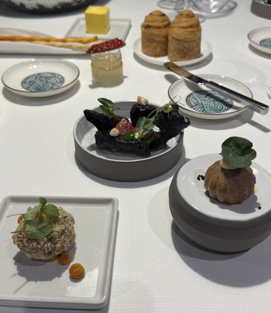 La serata del 7 marzo non è stata una cena come le altre, ma una narrazione fatta di sapori autentici e accostamenti studiati con maestria. Il percorso è iniziato con una serie di amuse-bouche, piccoli assaggi pensati per introdurre gli ospiti in un viaggio sensoriale nel cuore della Basilicata, accompagnati dalla freschezza minerale dello Spumante Brut Bianco “Vulcano 800”.