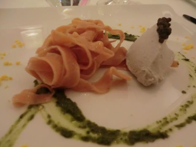 gelato di anguilla, caviale Oscetra, pasta ai sentori di rosa con salsa vegetale e tuorlo d'uovo biologico