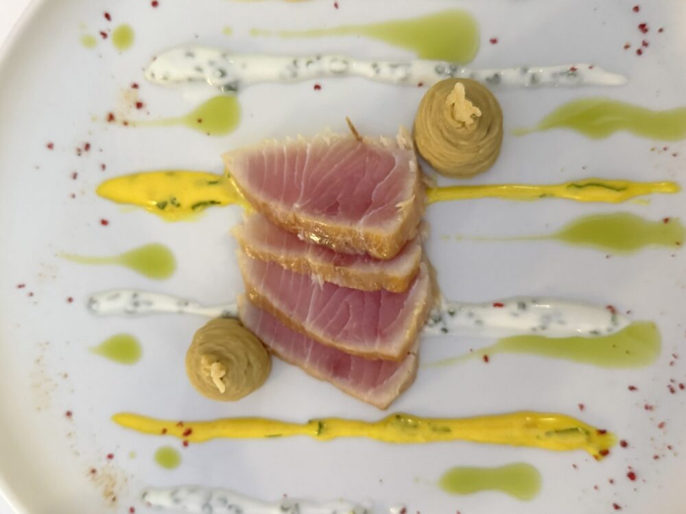 Ricciola affumicata con un concentrato di fave e chips di zenzero, una maionese all’aglio fritto, olio, salsa yogurt con erba cipollina e una farina scorzetta di cedrangolo.