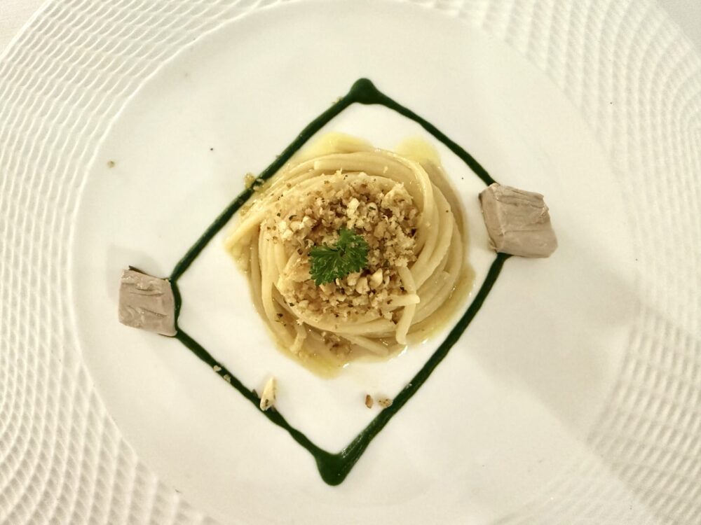 Spaghetto aglio olio peperoncino e prezzemolo. Alla base una salsa di tonno alla lunga, al di sopra pan grattato, cipolla caramellata e pinoli, ai lati sgombro marinato in carpione e per finire una salsa verde a prezzemolo.