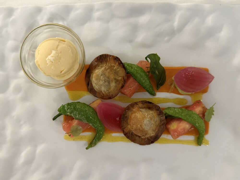 Una base di salsa di peperone e pomodoro, una salsa agrodolce con curcuma, ravioli ripieni di funghi pioppini della sila e porro, friggitello fritto, un cuore di bue, cipolla rossa marinata in aceto e pomodoro, uncroccante di basilico, spaghetti di cetriolo e in accompagnamento un gelato al rafano.