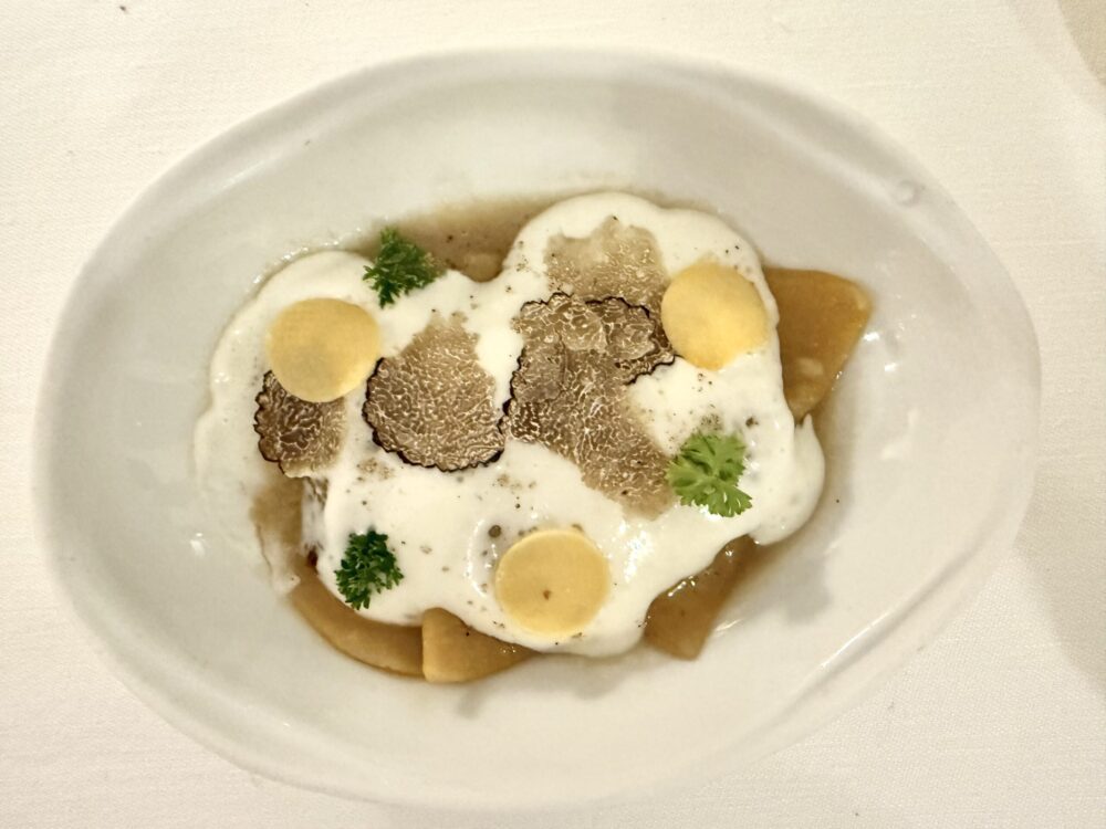 Raviolo di pasta fresca, una genovese di manzo, chips di parmigiano, taratufo nero