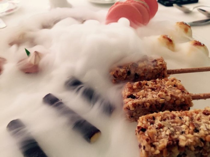 Don Alfonso, salsiccia di pezzogna, pistacchi, mozzarella zucchine e tartufo nero con salsa candita (2013)