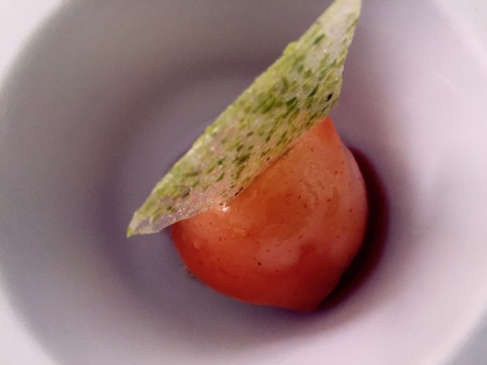 Don Alfonso, zuppa caldadi pomodoro in crosta di pane ai semi di papavero con granchio e origano (2014)
