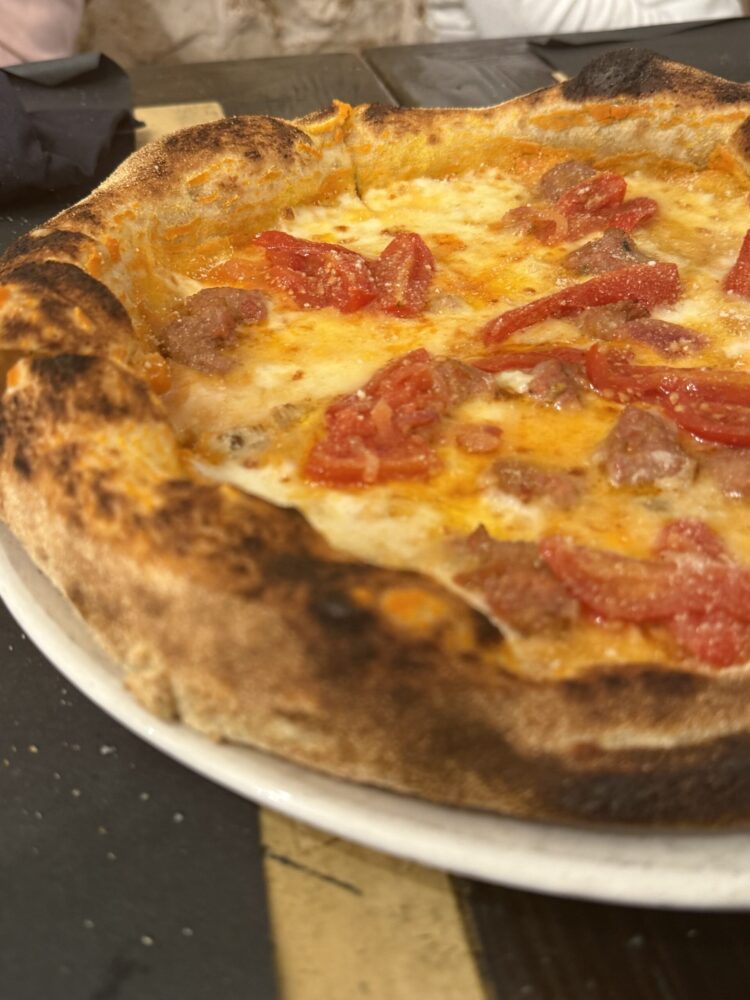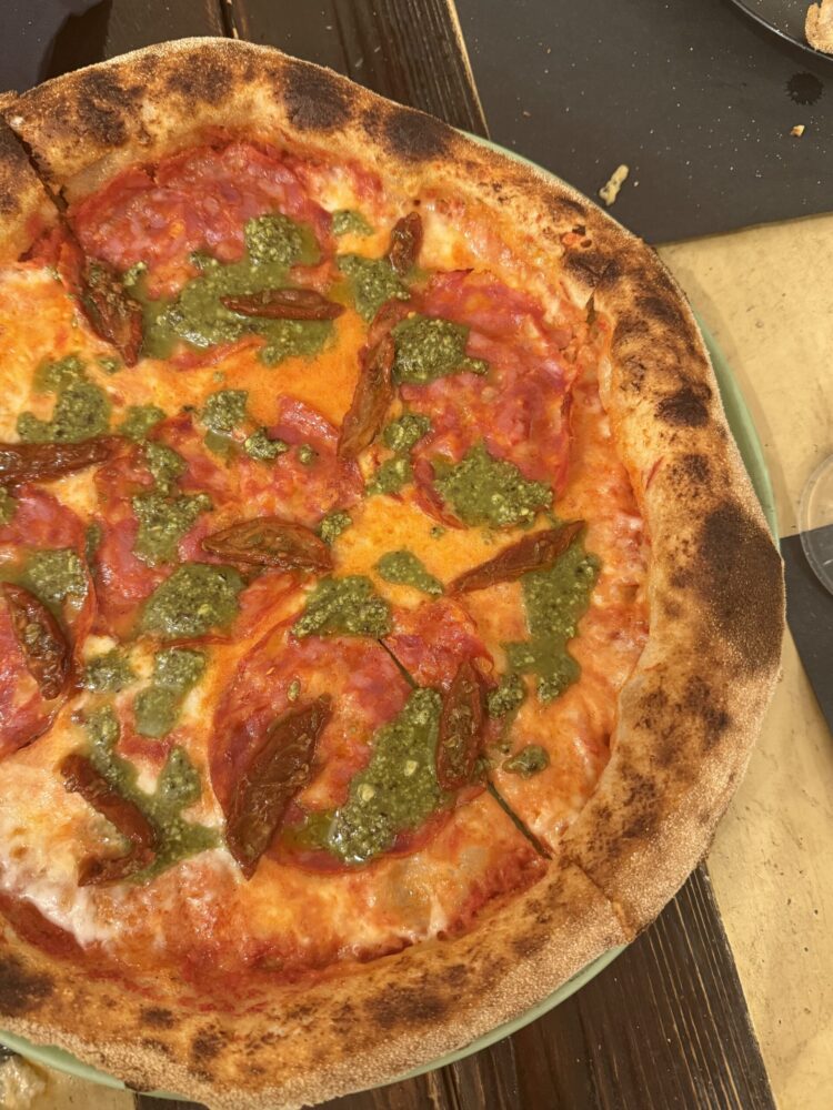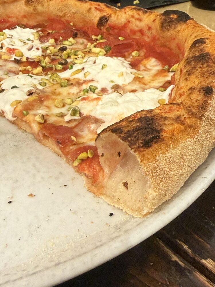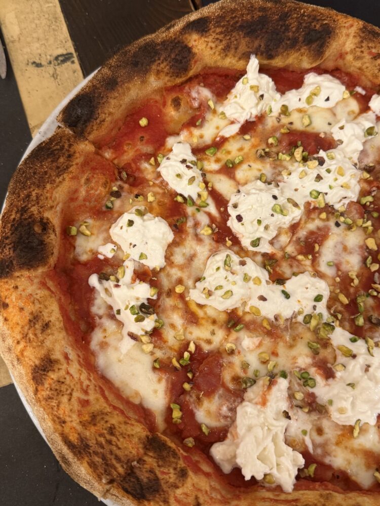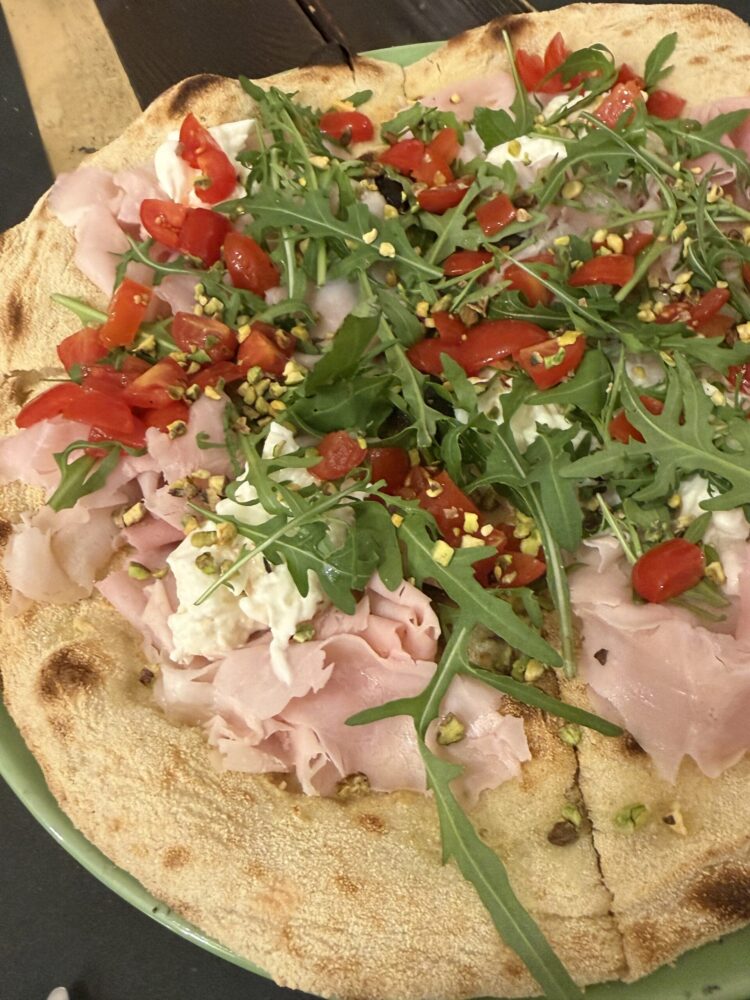 Poi l’Annina, con capocollo, pomodoro, mozzarella, stracciatella e pistacchio. Una pizza di carattere che unisce dolcezza, sapidità e una nota rustica e piacevole, costo 8€.