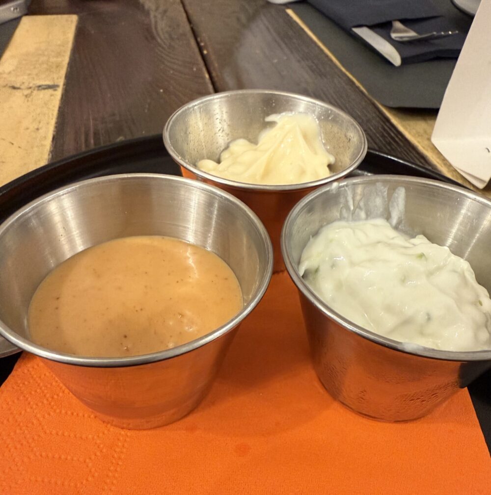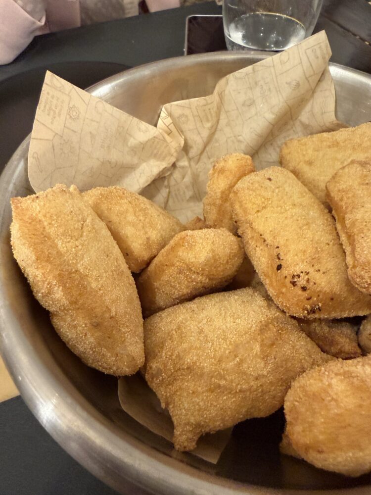 Prima delle pizze abbiamo preso due antipasti “di passaggio”, senza particolari aspettative, filetti di pollo CBT e frittelle con salse. Invece ci hanno sorpreso. Il pollo, cotto a bassa temperatura, era tenero e saporito. Le frittelle leggere e croccanti, accompagnate da salse tutte fatte in casa. Dettagli che altrove vengono spesso dati per scontati o acquistati già pronti, mentre qui raccontano impegno, cura e una visione chiara.