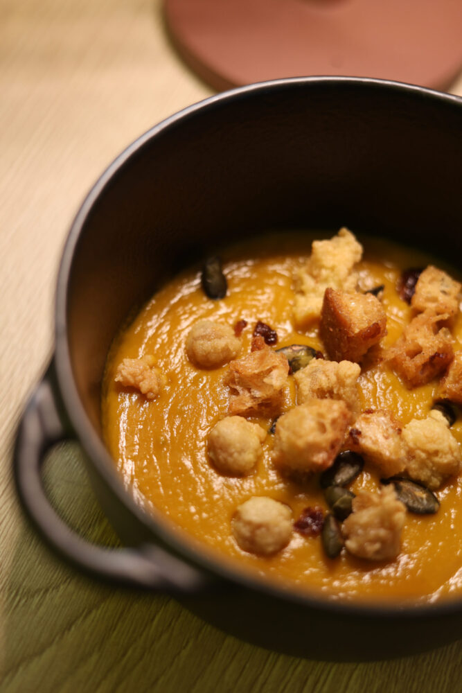È seguita una vellutata di zucca mantovana mantecata con burro danese salato, semi di zucca croccanti, crostini al guanciale e ceci in tempura, comfort food che sorprende grazie ai contrasti di consistenze.