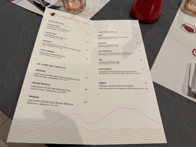 Donna Brigida, con un’altra sede anche a Cercola, ha scelto di raccontare questi due areali protagonisti del Vesuvio attraverso una carta dei vini costruita con identità, composta da tre cantine: Casa Setaro, Cantine Olivella e Le Lune del Vesuvio, per un totale di tredici etichette, tra vini fermi e spumantizzati. Una selezione pensata per dialogare con il menù, con rotazioni stagionali e inserimenti mirati, in base alle produzioni, alle annate e ai periodi dell’anno, sempre in sintonia con l’offerta gastronomica.