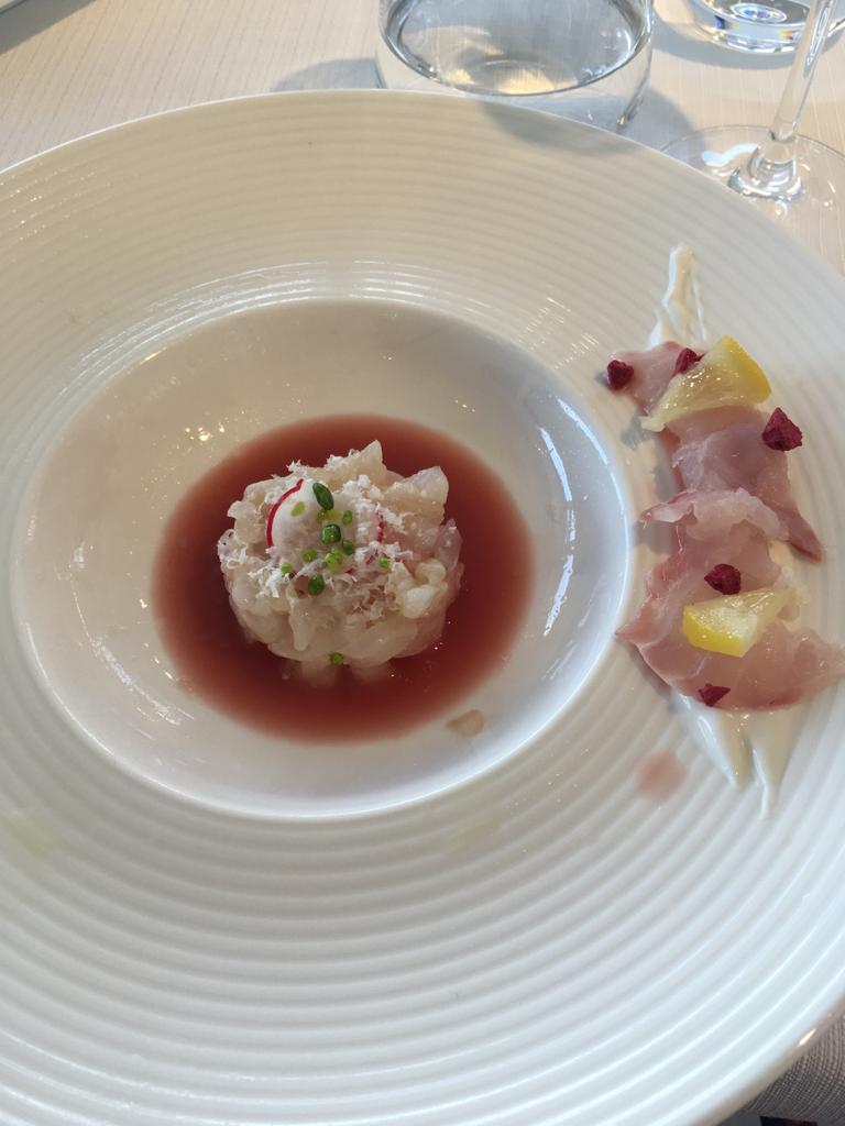 Donna Gina a Polignano con i fratelli Sgarra: si inizia con la pescheria, dove si esibiscono i frutti di mare sempre freschi e il crudo di scampi, gamberi o pescato locale, reinterpretato e valorizzato nel piatto, ma mai snaturato nella sua essenza (nella foto, tartare di pescatrice su tartare di melone con succo di melograno; accanto, sul bordo, carpaccio di pescatrice su panna acida con lampone disidratato). Tra gli antipasti, oltre ai sapori di mare, spuntano “gli amori di terra” di Sgarra: la cicoria con la crema di fava di Carpino, unite al bianchetto locale, e la melanzana in pasta fillo con un saggio di burrata di Andria.