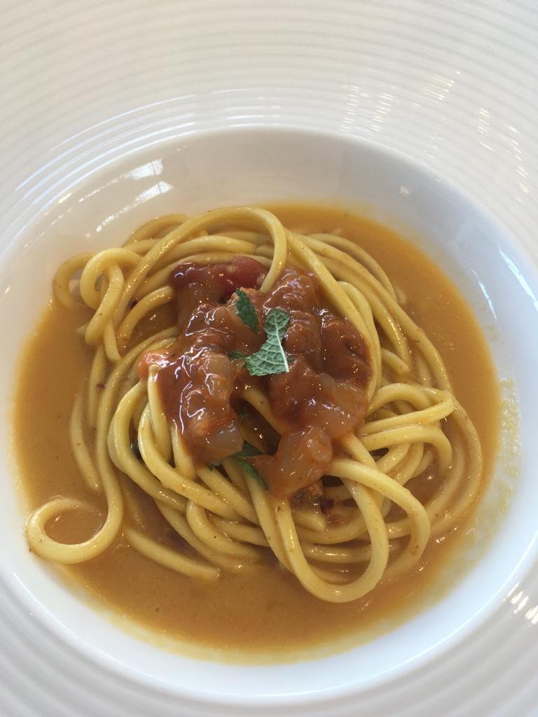 Nella lista dei primi, tra cavatelli ai frutti di mare e ceci neri, e il riso con gambero rosso ed erbette, spicca un vero gioiello: i troccoli con battuto di scampi e polpa di ricci su crema di datterino giallo (nella foto). Più che un piatto, un Big Bang di sapori primordiali, che danno vita in bocca ad un nuovo mondo. Per i fedeli alla linea, imperdibile anche l’orecchietta di grano arso, cime di rapa e burrata di Andria.