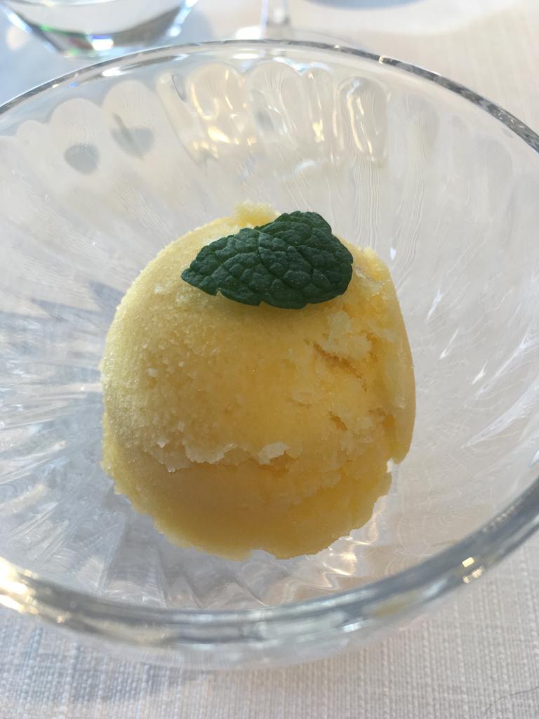 Sorbetti freschi e aromatici come pre-dessert, come quello al mandarino, ma anche un set di formaggi caprini, Mimolette, Castelmagno ed erborinati vari.