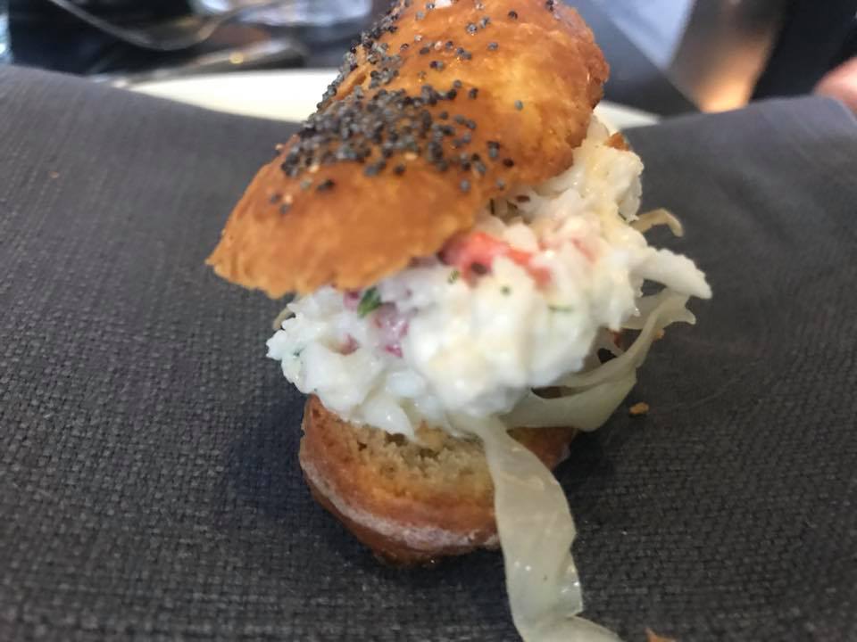 Il locale è cool, modaiolo, pietra e metallo creano un ambiente caldo e moderno, luci soffuse, musica , gente allegra. Si può decidere di mangiare nella parte ristorante o direttamente al bancone bar con la vista sulla cucina. La sorpresa è stata trovare una cucina interessante sia negli abbinamenti che nelle tecniche, non scontata e banale con una ricerca continua a trovare spigolature nel gusto. Gli ingredienti danesi prevalgono lasciando porte aperte ad interessanti contaminazioni. Le uova di pesce, elemento sapido dell’intera cucina del Nord, sono largamente utilizzate come esaltatore di gusto e stimolo appagante. Tecniche di preparazione e cottura molto precise e corrette. Un cestino di pane caldo ai cereali per iniziare e tanto burro grasso e saporito renderanno subito confortevole la cena.