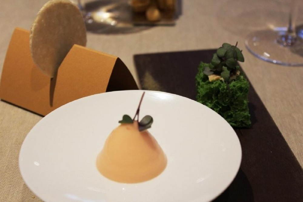- Piazza Duomo, Enrico Crippa, Cialda di arachidi, foie gras e gingerino, spugna di bietola alla salsa tonnata
