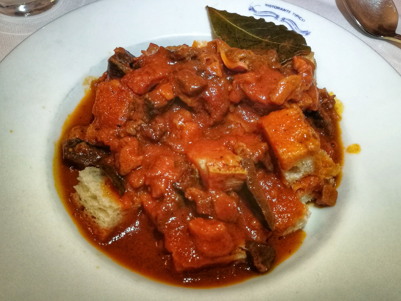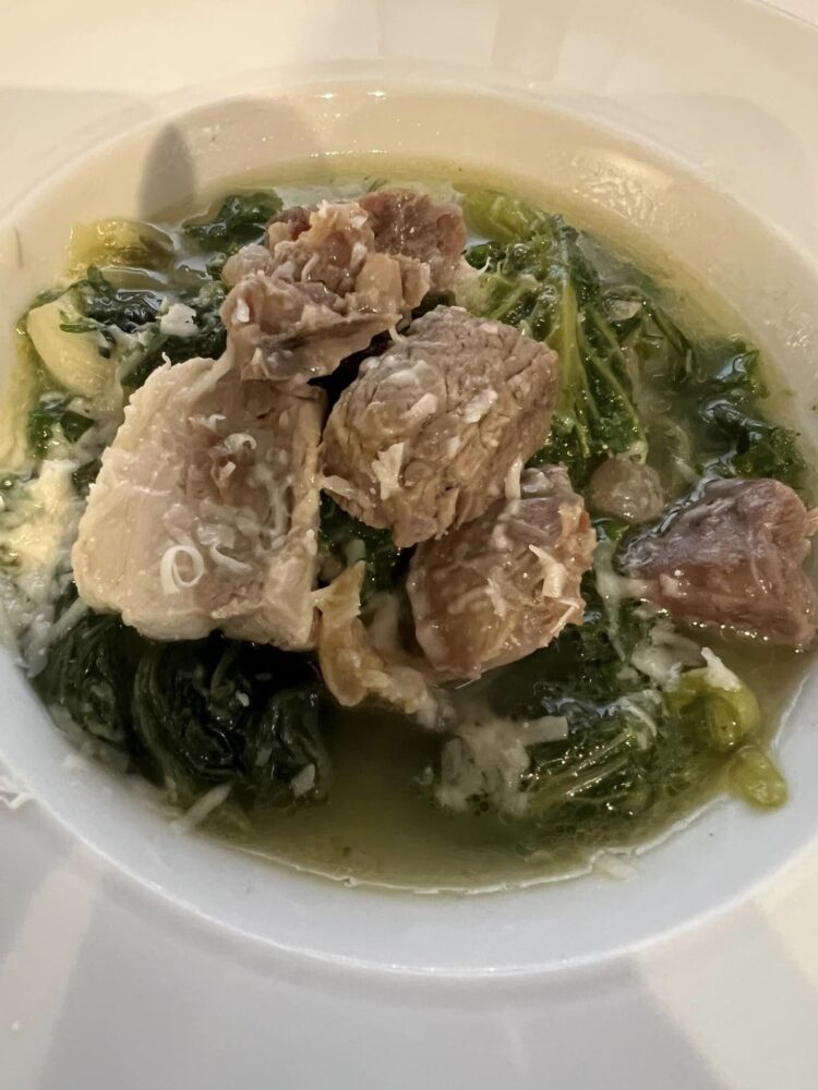Come secondi: zuppa di soffritto e involtini di interiora di agnello con patate al forno.