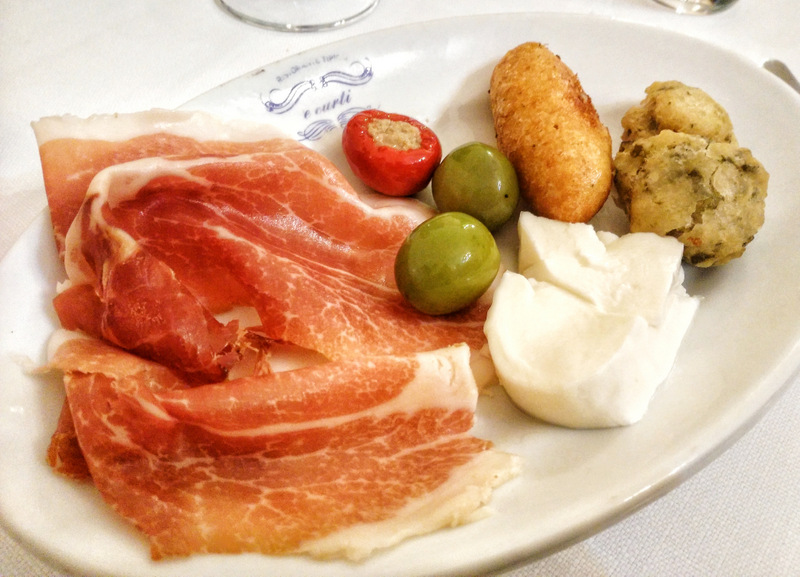 Si è iniziato con un antipasto di terra: uno splendido prosciutto crudo irpino (al naso sviluppava bei sentori di frutta secca), mozzarella, olive da tavola, frittelle di friarielli (ottime, l’olio per il fritto era pulito) ed un crocchè nella cui fase di preparazione sono convinto che l’inserimento del formaggio (credo fosse parmigiano) abbia giocato un ruolo essenziale per la sua godibilità finale.