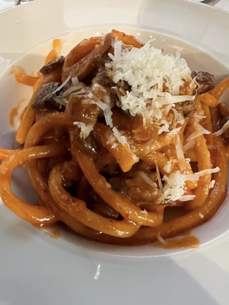 I bucatini con soffritto e grattata di pecorino sono assimilabili ad un brano jazz: cambi repentini di ritmo tra pasta ed intensità del soffritto, dei ex machinis continui e rapimento dei sensi. Mai mangiati di così buoni.