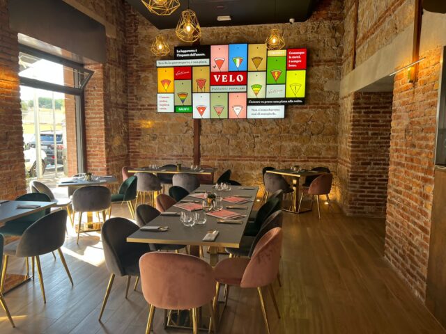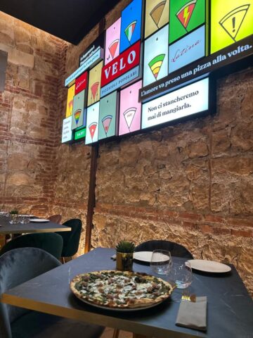 Velo infatti, è il nome della pizzeria che riconduce alla sottigliezza del disco della pizza, che in area pontina e ciociara è stata dimenticata per fare spazio all’impasto elastico, alveolato e dal cornicione alto, dallo stile contemporaneo o napoletana. Per anni obliata per far posto ad altre performance, la pizza romana vede la luce attraverso un nuovo progetto: Luca Mastracci e i soci Dario Scodavolpe, Costantino Sicconi e la famiglia Luparo sono impegnati nella pizzeria di 120 coperti, dall’arredo moderno e curata in ogni dettaglio, che apre dove negli anni cinquanta del secolo scorso fu la sede di uno storico bar e a seguire di una pizzeria.