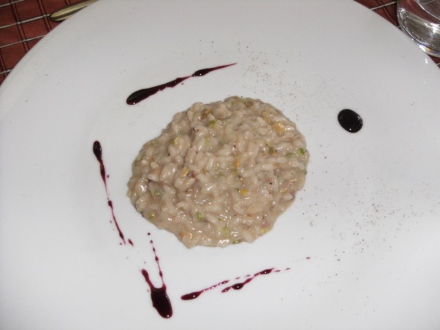 Detto questo, passiamo ora alle portate successive. Risotto con fichi bianchi del Cilento, pistacchi e provola con riduzione di vino rosso. L’ho già detto altre volte: amo più il riso che la pasta e, quindi, questo piatto mi trova pienamente soddisfatto, anche se qui al sud è difficile trovare un risotto modello lombardo-veneto-piemontese.