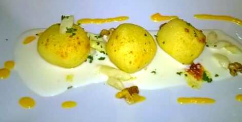 Chef in Tour, gnocchi di patate con cuore di mozzarella su caprino erborinato sciolto, asparagine bianche, gocce di zucca e noci tostate
