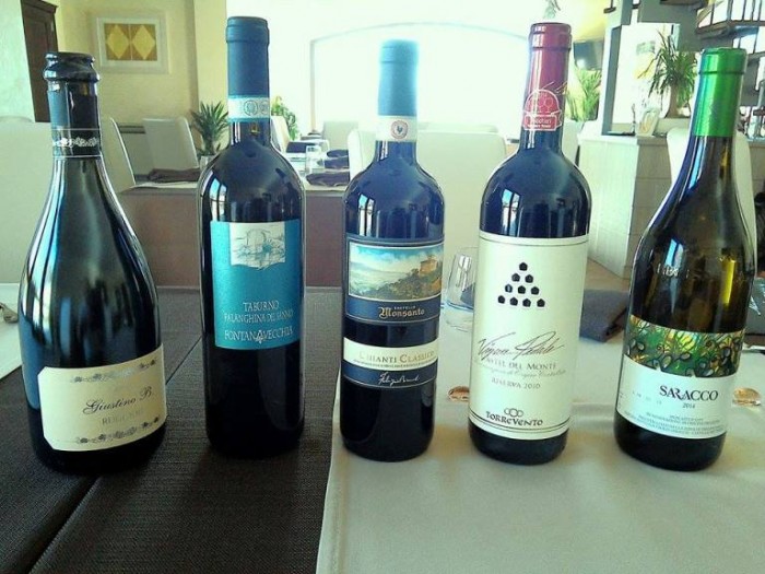 Questi i vini selezionati dall’enoteca San Pietro di Salerno in abbinamento ai piatti: Valdobbiadene Prosecco Superiore DOCG Extra Dry Giustino B. 2010 Ruggeri, Falanghina del Taburno 2014 Fontanavecchia, Chianti Classico 2012 Monsanto, Vigna del Pedale Riserva 2010 Torrevento e Moscato d’Asti 2014 Saracco.