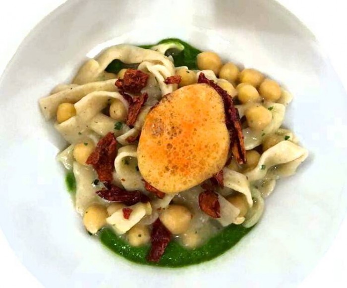 Chef in Tour, lagane di farro e ceci biologici su cremoso alle cime di rapa e peperoni cruschi di Senise in due consistenze