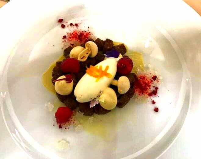 Chef in Tour, spicy crumble con cremoso al Jasmine tea, gelato alla ricotta e arancia Staccia di Tursi, funghetti alla liquirizia, lamponi e gelatina al moscato