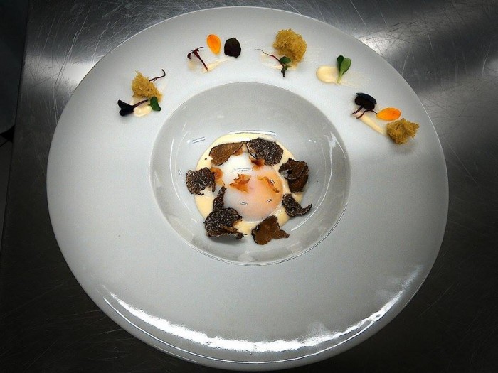 A seguire uovo bio cotto al roner su fonduta al caciocavallo podolico, spugna al tartufo e guanciale croccante.