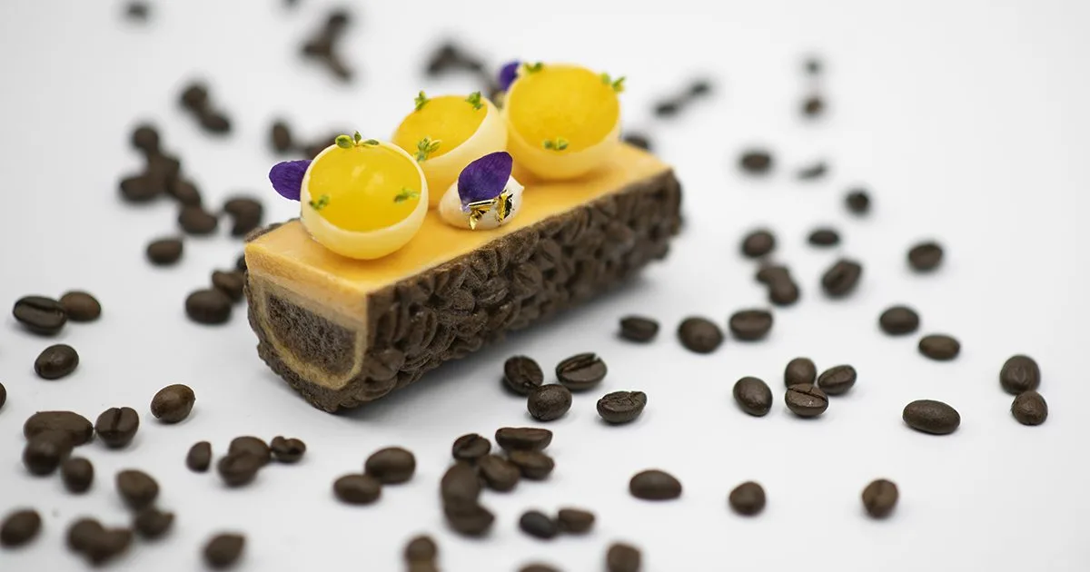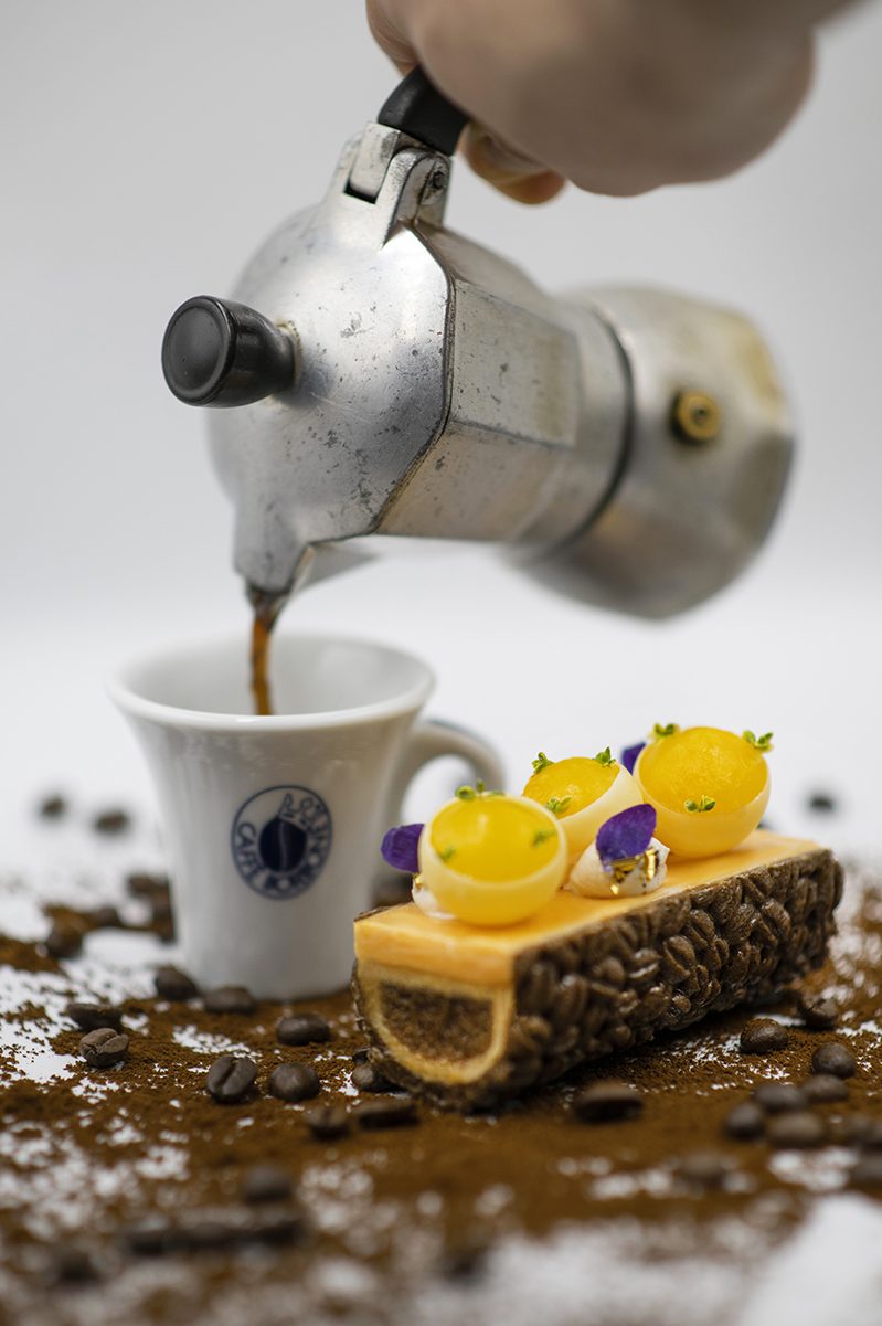 La proposta si compone di due differenti fasi: la prima consiste nell’assaporare tre piccole “sferificazioni croccanti” che rinfrescano e allo stesso tempo addolciscono il palato, preparandolo a degustare il morso successivo; la seconda è composta da una frolla esterna, che accoglie consistenze e ingredienti più “caldi e morbidi”, caratteristiche perfette prima di gustare un buon caffè.