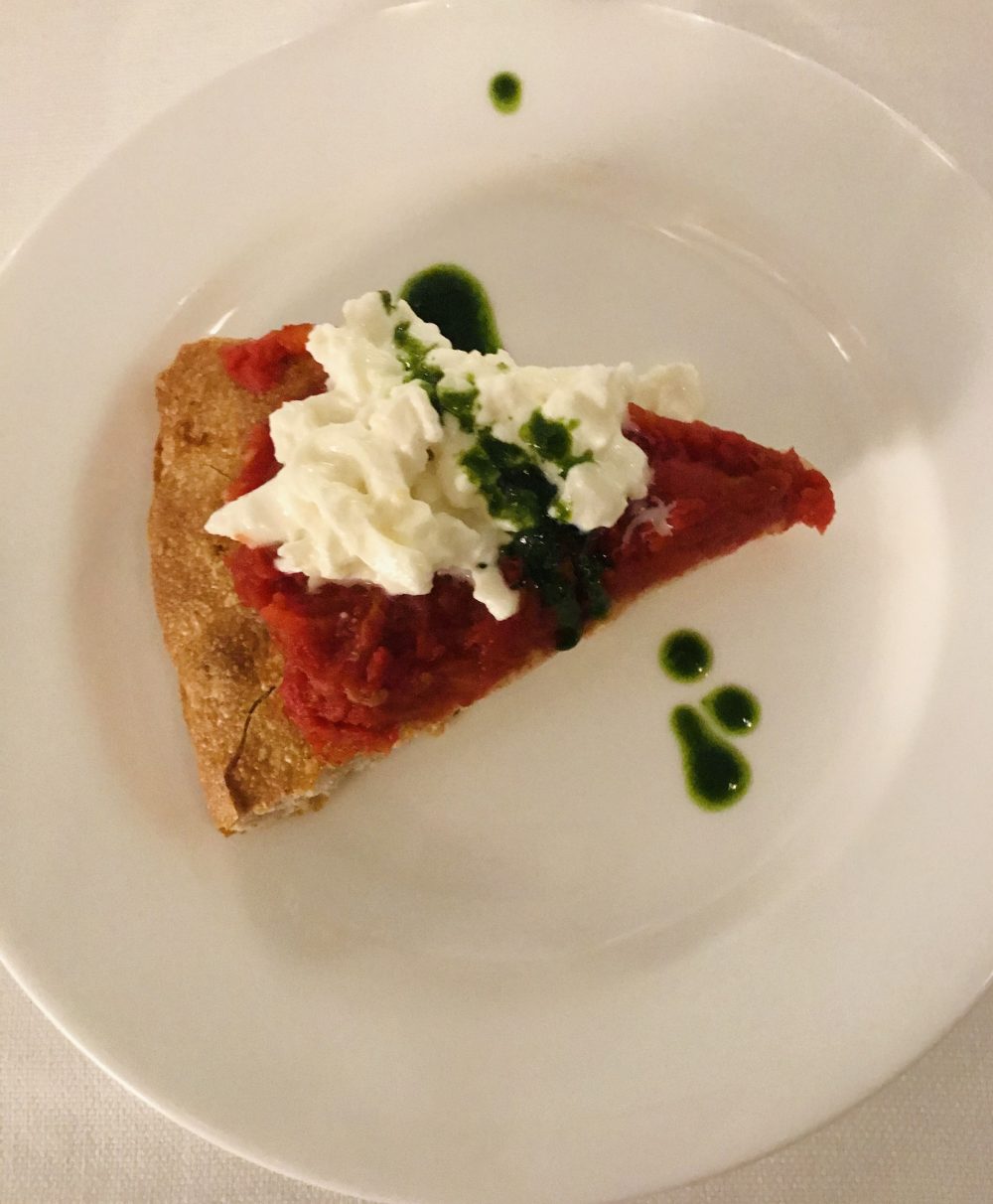 “In punta di forchetta” è il tema della serata dedicata alla pizza di Simone Padoan che – in sei spicchi – racconta parte della sua esistenza, dedicata alla ricerca degli ingredienti, oggi più territoriali rispetto agli anni passati, e al perfezionamento degli impasti. La Margherita Croccante è il degno inizio di un viaggio di scoperte: caratterizzata da tre cotture – vapore, forno ventilato e forno a legna – e poi condita con pomodoro e burrata pugliese.