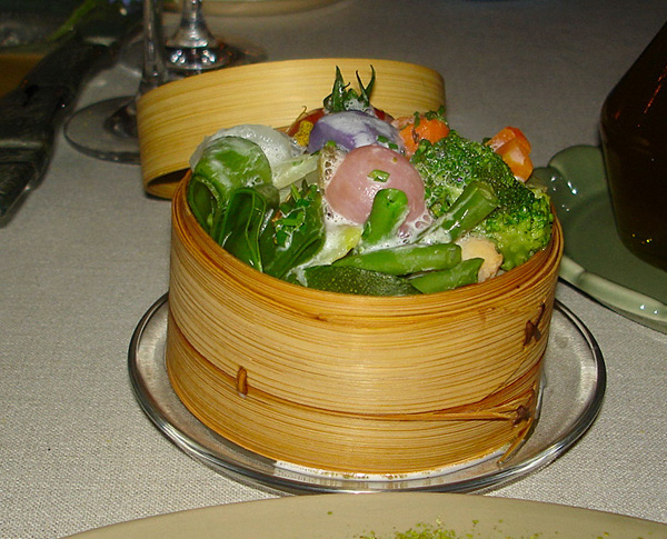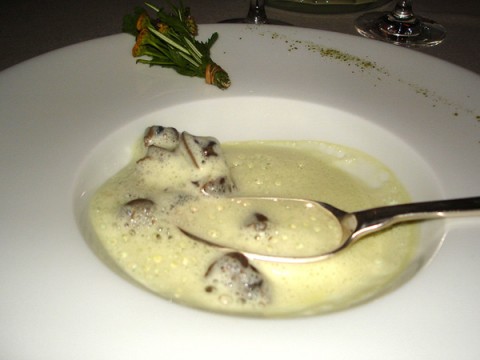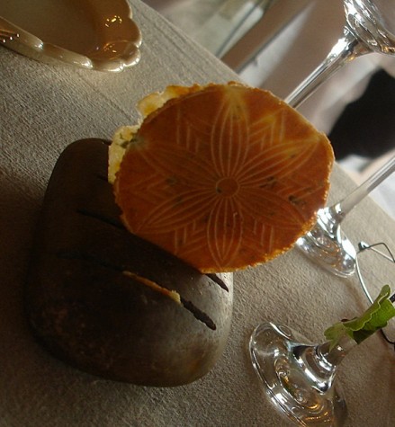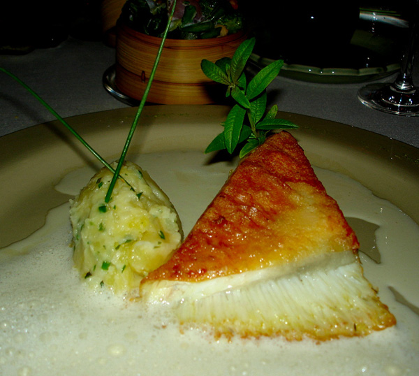 Il bellissimo trancio di rombo diventa inutile, anche se preso singolarmente ricorda lo splendido omble chevalier a la verveine di Veyrat, ma qui la differenza la fanno tutti gli elementi vegetali messi insieme o presi singolarmente, come i piccoli tocchetti infilati nel cofanetto al vapore dove l’intingolo aromatizzato dalla raffinata erba fa dimenticare qualsiasi pesce del Mediterraneo.